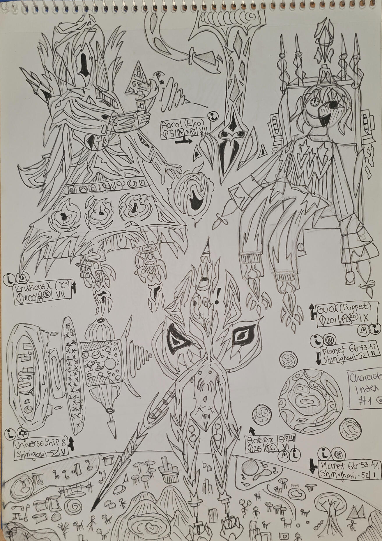 KASTRO ISn't just the fictional WORLDBUILDING project of andrej synkar, which he has been working on technically all his life, but also has been built up as a secret religion (Sila nepantla), as a collection of juvenile writings spanning thousands of pages (zera) and even as a whole franchise with its own maps and universe of thousands of characters (bellaliena). but it also serves to underline andrej's entire mental state, given that the illustrAtions began when he was around six years old whereas work on the sci-fi books began when he was fourteen. the kastro universe features thousands of unique characters, events, locations, ideas and even terminology and invented languages, supplied by illustrations, careful indexing and elaborations and other unique devices, making it a very valuable collection of manuscripts for whatever insane archeologist with all the wrong fetishes wants to steal it. the illustrations continued all the way into 2022, subsiding around that time when andrej started his philosophical ambitions, before he returned to it with new passions to expand it into a proper popular media world.